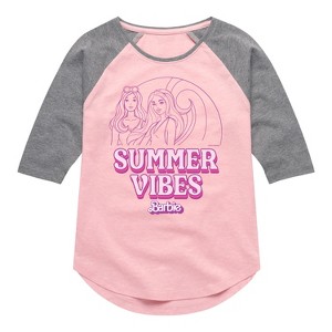 Barbie - Summer Vibes - Barbie and Friend - Toddler And Youth Girls Raglan Graphic T-Shirt - Step into the glamorous pink world of Barbie with our officially licensed graphic garments for the fashion-forward! Whether you dream of being a fashion designer, a mermaid princess, or a world-traveling explorer, our garments bring Barbie's world to life with vibrant colors and playful prints. Crafted with quality materials and attention to detail, each piece ensures comfort and durability for all-day play. Express your unique sense of style and imagination with our exclusive Barbie graphic apparel!