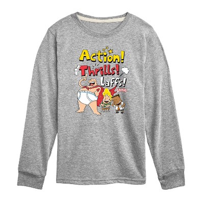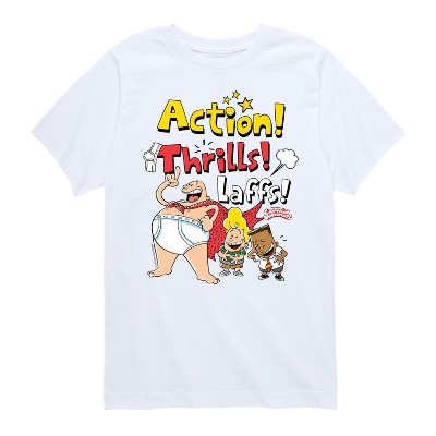 Captain Underpants - Action Thrills & Laffs - Toddler & Youth Girls Short Sleeve Graphic T-Shirt - Celebrate the essence of Universal's Captain Underpants with officially licensed apparel featuring unique designs crafted exclusively by Hybrid Apparel. Each piece brings beloved characters, iconic imagery, and memorable moments to life, offering Captain Underpants fans a one-of-a-kind way to showcase their passion.