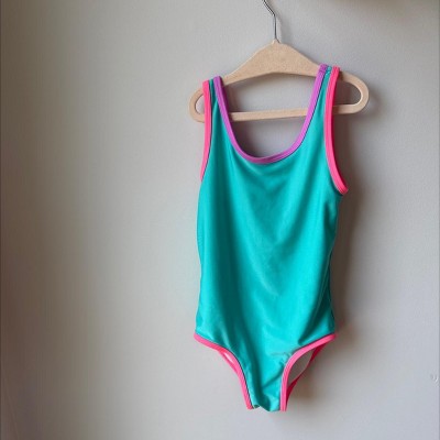 Elevate your kid's summer looks with the Colorful Pop Binding One-Piece Swimsuit from Cat & Jack™. This one-piece swimsuit features a solid-color design with contrast trim for a sweet, eye-catching look. Made of recycled polyester fabric with spandex and elastic at leg openings, this swimsuit with full lining offers flexibility and comfort. Plus, this full-coverage swimsuit has a UPF 50+ rated design to help keep their skin shielded from harmful sun rays.