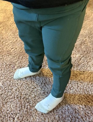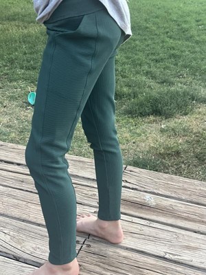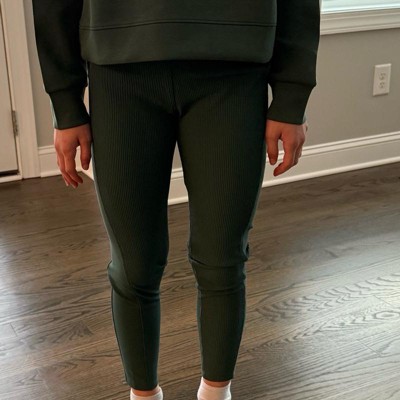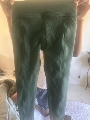 I love these ribbed textured leggings. They fit well and are made from a thick stretchy material. The neutral shade of green matches lots of stuff. They hold up wonderful in the wash. These are perfect for play or exercise.