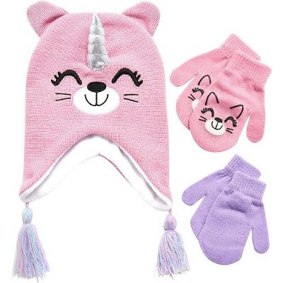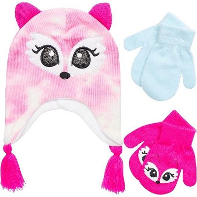 Laplander style girls winter hats and gloves or mittens set are made of a durable acrylic knit exterior and a soft micro-fleece inside lining for comfort and warmth. The toddler winter hat features fleece with embroidered character details and braided tassels on the side.