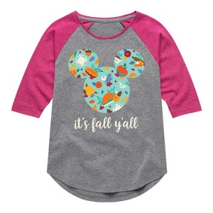 Mickey & Friends - Its Fall Yall - Toddler and Youth Girls Raglan Graphic T-Shirt - Add a touch of magic to your wardrobe with this graphic apparel featuring iconic Disney designs. Showcasing beloved characters and classic imagery, each piece combines nostalgic charm with modern style—perfect for Disney fans of all ages. Whether you're headed to the parks or just adding whimsy to your everyday look, these graphics bring the magic to life.