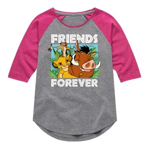 The Lion King - Simba Pumbaa, & Timon - Best Friends - Toddler & Youth Girls Raglan Graphic T-Shirt - Add a touch of magic to your wardrobe with this graphic apparel featuring iconic Disney designs. Showcasing beloved characters and classic imagery, each piece combines nostalgic charm with modern style—perfect for Disney fans of all ages. Whether you're headed to the parks or just adding whimsy to your everyday look, these graphics bring the magic to life.