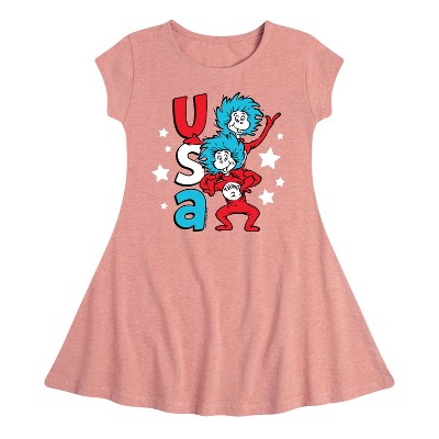 Dr. Seuss - Cat In The Hat USA - Toddler And Youth Girls Fit And Flare Dress - Our collection of graphic apparel featuring officially licensed Dr. Seuss characters brings the whimsy and wonder of Seussville straight into your wardrobe. From the mischievous Cat in the Hat to the stinky Grinch, each design showcases iconic characters and scenes from Dr. Seuss's timeless stories.