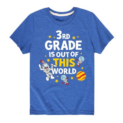 Dr. Seuss - Third Grade Out Of This World - Youth Girls Short Sleeve Graphic T-Shirt - Our collection of graphic apparel featuring officially licensed Dr. Seuss characters brings the whimsy and wonder of Seussville straight into your wardrobe. From the mischievous Cat in the Hat to the stinky Grinch, each design showcases iconic characters and scenes from Dr. Seuss's timeless stories.
