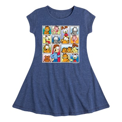 Garfield - Faces Grid - Toddler And Youth Girls Fit And Flare Dress - Bring the humor and laziness of the famous orange cat to your wardrobe with Garfield graphic apparel. Featuring Garfield, Odie, and Jon, these designs celebrate the iconic comic strip and its beloved characters.