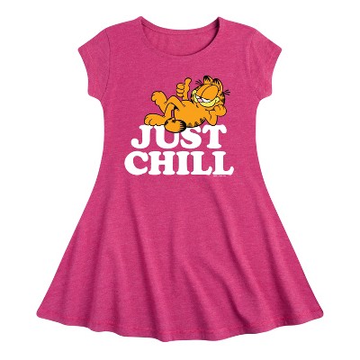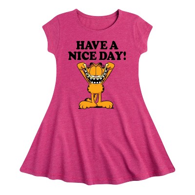 Garfield - Let Me Be Frank - Toddler And Youth Girls Fit And Flare Dress - Bring the humor and laziness of the famous orange cat to your wardrobe with Garfield graphic apparel. Featuring Garfield, Odie, and Jon, these designs celebrate the iconic comic strip and its beloved characters.