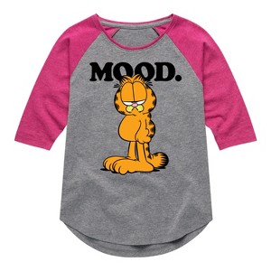 Garfield - Mood - Toddler And Youth Girls Raglan Graphic T-Shirt - Bring the humor and laziness of the famous orange cat to your wardrobe with Garfield graphic apparel. Featuring Garfield, Odie, and Jon, these designs celebrate the iconic comic strip and its beloved characters.