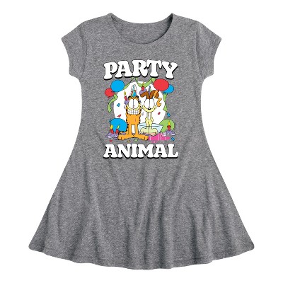 Garfield - Party Animal - Toddler & Youth Girls Fit & Flare Dress - Bring the humor and laziness of the famous orange cat to your wardrobe with Garfield graphic apparel. Featuring Garfield, Odie, and Jon, these designs celebrate the iconic comic strip and its beloved characters.