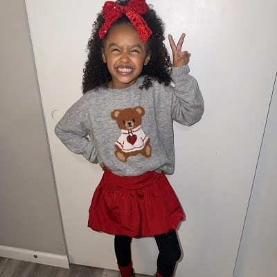 Absolutely adorable!! Sweater is super soft and not itchy. Wearing a Medium in top and Small in skirt. Entire outfit from Target, even her socks.