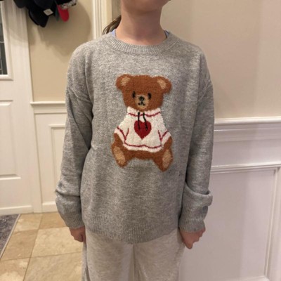 [This review was collected as part of a promotion.] My daughter is 4’4” 60lbs. I ordered a size medium (8) for her and this fit so well. The sweater itself is soft and cozy feeling. She said it was oversized in a cute way. The bear on the front is a different fuzzy texture which is really fun. The fit is meant to be oversized, I think it would pair so well with leggings. I love the gray color. There’s a stripe down the back of the sweater too!