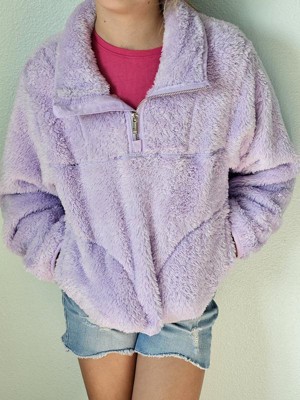 Super soft and comfortable half zip sweatshirt for girls. It is more of a periwinkle color but has a good fluff to it. It is also warm enough for mild days and can easily be taken on and off. It comes true to size with a slight oversized fit to fit the fashion of today.