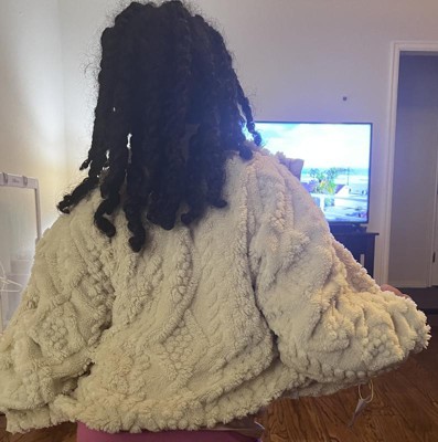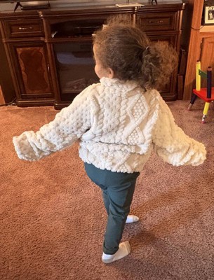 This jacket is super soft and really comfy. The cream color is nice and goes with a lot of outfits. I like the fun texture, but the sleeves are a little short. Besides that, it feels great to wear and keeps me warm. If the sleeves were longer, it would be perfect for this fall.