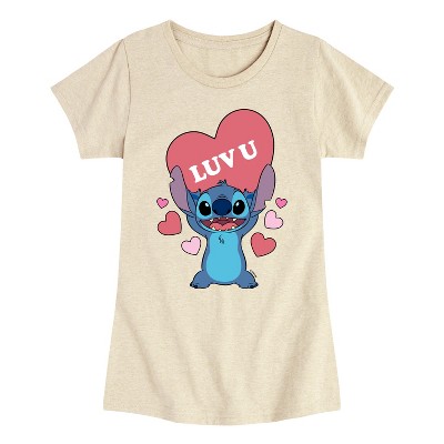 Lilo & Stitch - Happy Valentine's Day - Youth Girls Fitted Short Sleeve T-Shirt - Celebrate the ohana with Lilo & Stitch graphic apparel, blending new visuals with classic heartwarming moments featuring Lilo, Stitch, and the bonds of family.