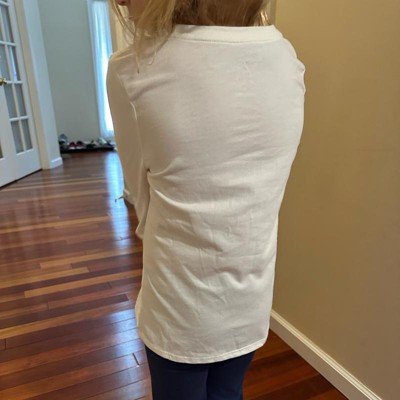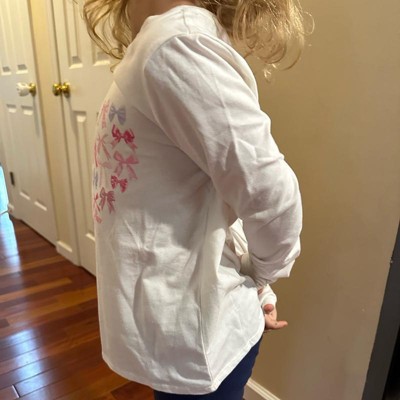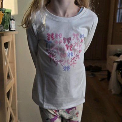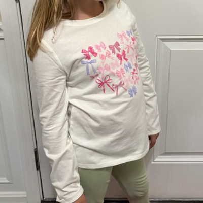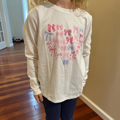 [This review was collected as part of a promotion.] (6 year old - wearing size 6) We recently purchased this Long Sleeve 'Bow Heart' Graphic T-Shirt from Cat & Jack for our daughter and its become one of her favorite shirts. We love the fact its long sleeved since the colder months are approaching. The sizing is perfect to size - great length and sleeve length. The design on the front is super cute! A nice Heart made out of pink bows! Would recommend.