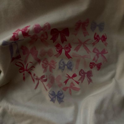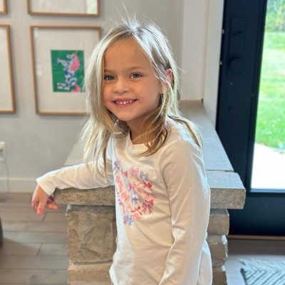 [This review was collected as part of a promotion.] this long sleeved graphic tee has really cute pink and purple bow artwork which my five year old daughter immediately gravitated towards. we purchased a size extra small and she usually wears a 5, 6, or 5/6. Like other cat and jack it runs a bit big but she still loved it so much she wanted to wear it two days in a row! high praise from my kid and a great deal at this price point.