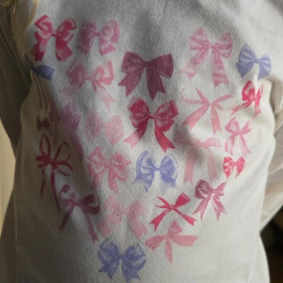 [This review was collected as part of a promotion.] The long sleeve bow heart shirt is the cutest thing! Bows are a huge trend right now and who doesn’t love a big heart?! I love how there are different shades of pink and purple. We normally wear a medium (8) and got a medium it fits true to size with no room to grow. The long sleeves did well and fit right around our wrist. The length is good but for longer wear I would probably size up. All in all we love this shirt!