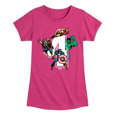 Girls' Marvel Avengers Group Rainbow Fitted Short Sleeve Graphic T-Shirt - Heather Fuchsia - X-Large