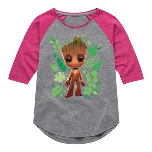Girls' - Marvel - Guardians of the Galaxy Baby Groot Leaf Shirt Tail Raglan Graphic T-shirt - 1 of 4