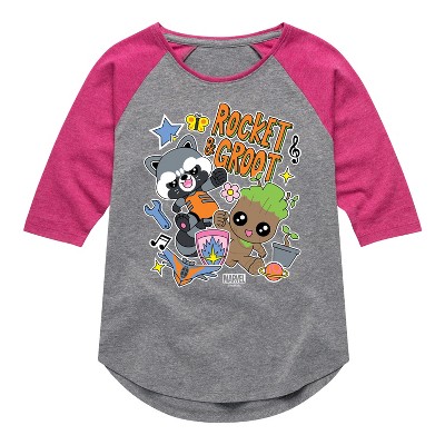 Girls' - Marvel - Guardians of the Galaxy Groot And Rocket Sticker Shirt Tail Raglan Graphic T-shirt