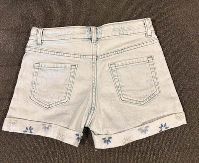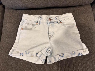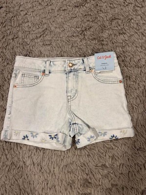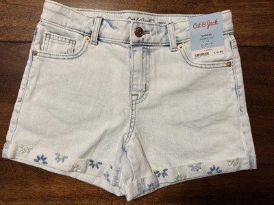 Refresh their warm-weather clothing with these Mid-Rise Embroidered Cuffed Denim Shorts from Cat & Jack™. Made from denim fabric with added stretch for comfortable wear, the mid-rise shorts feature distressed detailing with embroidered cuffs for a cool look. The adjustable waistband with a fly snap and zipper closure lends a snug fit, while the front and back pockets provide space for small essentials. They can pair them with a range of shirts and sweaters along with sneakers for versatile outfit options.