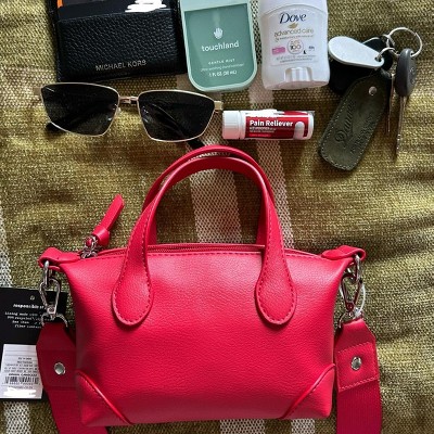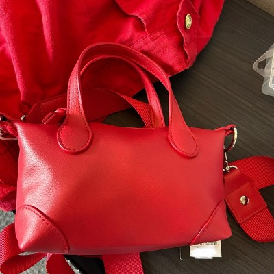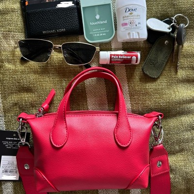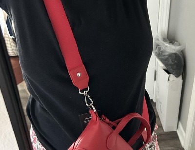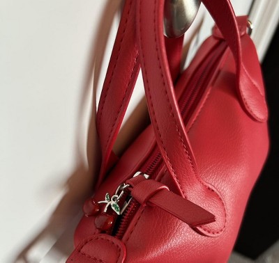 I am a 28 year old and this purse was a perfect match to some of my clothing pieces. I was worried since it was for younger girls and went to check it out in store to see if it would fit my phone and have a long enough strap. It is a small purse but I love the minimal look + silver hardware. The price is a steal as well. The strap is adjustable and works perfectly length wise (I’m 5’2). I have an iPhone 14 and it fits, along with the items in my review pictures. The cherry zipper is cute! Nobody has any reviews on the red version so hopefully this helps!