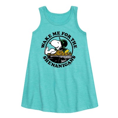 Peanuts - Wake Me Shenanigans - Toddler and Youth Girls Fit And Flare Cap Sleeve Dress - From the best-loved comic strip in history comes officially licensed PEANUTS apparel for fans everywhere. Show your love for Charlie Brown, Snoopy, Woodstock, Lucy, Linus, Pigpen and the whole gang. Copyright Peanuts.
