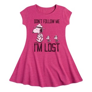 Peanuts - Don't Follow Me Art - Toddler And Youth Girls Fit And Flare Dress - From the best-loved comic strip in history comes officially licensed PEANUTS apparel for fans everywhere. Show your love for Charlie Brown, Snoopy, Woodstock, Lucy, Linus, Pigpen and the whole gang. Copyright Peanuts.