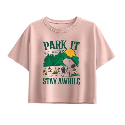Girls' Peanuts Park It And Stay Awhile Fitted Short Sleeve Graphic T-Shirt - Heather Pink - Large