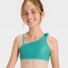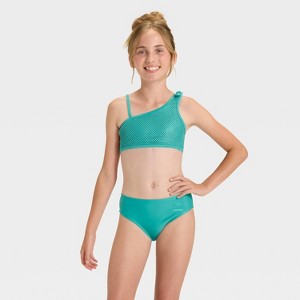 Bring textural charm to your kid's swim looks with the Pier Gaze Bikini Set from Cat & Jack™. This two-piece bikini set features a one-shoulder swim top with mesh-like detailing and a solid-color swim bottom, completing the sweet look. Tailored from recycled polyester-spandex fabric with full lining, this bikini set features a four-way stretch for comfortable wear while diving, playing in the sand, and beyond. Providing classic coverage, the pieces help keep them shielded from the sun's rays with a UPF 50+ rated design.
