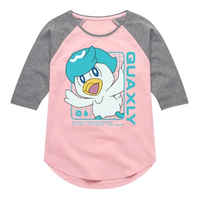 Pokémon - Quaxly Stats - Youth Girls Raglan Graphic T-Shirt - Celebrate the essence of Pokemon's Pokémon with officially licensed apparel featuring unique designs crafted exclusively by Hybrid Apparel. Each piece brings beloved characters, iconic imagery, and memorable moments to life, offering Pokémon fans a one-of-a-kind way to showcase their passion.