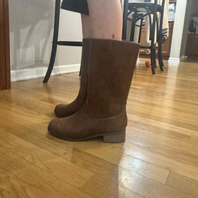 [This review was collected as part of a promotion.] These are a very practical sturdy tall brown colored boot. My 9 year old daughter is wearing the size 4 and this is the size she normally wears. They fit her great and they zipped up and went on easily. Perfect to go with fall and winter outfits. They are easy to team up with jeans and dresses. They are very fashionable and a wardrobe staple. They have a small flattering heel.