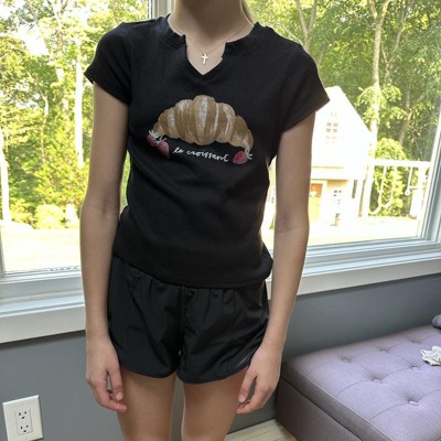 [This review was collected as part of a promotion.] This is a really cute fun top from Art Class. The croissant print is very eyecatching and the style is modern and sporty. This black top goes well with denim or a black skirt. It has French style and sass. My 8 year old slim daughter is wearing the size Medium 8 and it fits her perfectly in the body and looks flattering on. It would make a neat gift too. Suitable for all ages. I received an incentive to write this review.