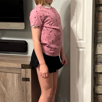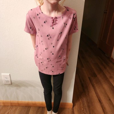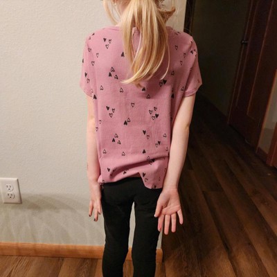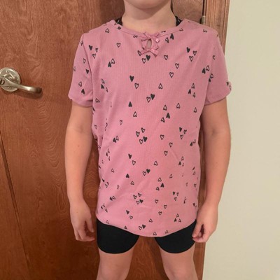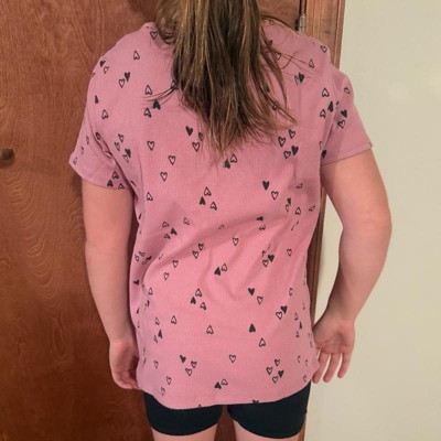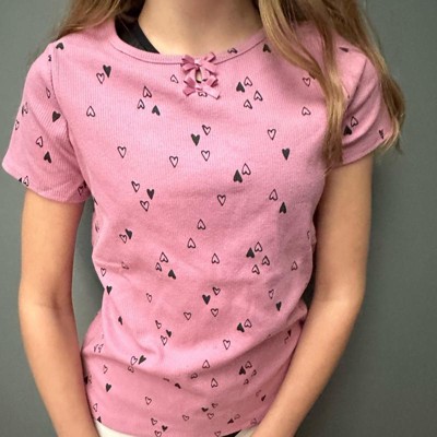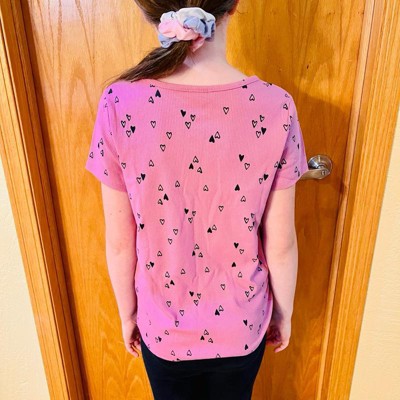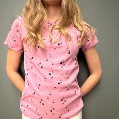 [This review was collected as part of a promotion.] My daughter is nine years old and normally wears size 10–12 in clothing which is a size large at target. This shirt fits true to size. This T-shirt is A mauve pink color with heart clusters all around it. This wasn’t my daughter‘s favorite shirt as she thought it looked more little kid instead of almost middle school age. She did like that it was short sleeved as she gets hot during the day.