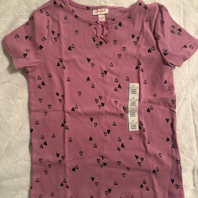 Update your child's everyday wardrobe with this Short-Sleeve Printed Ribbed T-shirt from Cat & Jack™. This pullover tee is crafted from a midweight cotton-recycled polyester blend with spandex for comfortable, flexible all-day wear. Tailored in a regular fit with below-waist length, this printed T-shirt with short sleeves is adorned with a ribbed texture and finished with a round neckline highlighted with a keyhole front and bow accents.
