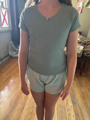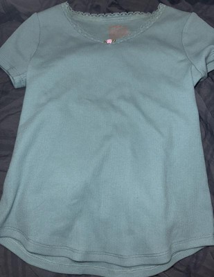 Whether relaxing at home or spending time with friends, your child will stay comfortable in this Short-Sleeve Ribbed T-Shirt from Cat & Jack™. Crafted from cotton-spandex blend 2x2 rib fabric, this short-sleeve T-shirt brings cool comfort to their day. Tailored in a slim-fit silhouette and designed with a V neckline, it features a ribbed texture with lace trim detailing on the neckline, making it a versatile choice for pairing with a range of casual outfits.