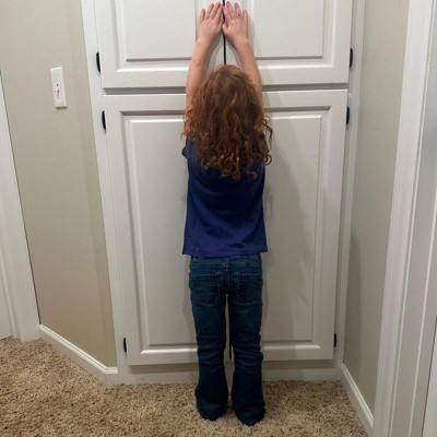 Have your child stand in front of the fridge.Mark the top of the head with a magnet. Measure a straight line from floor to magnet.