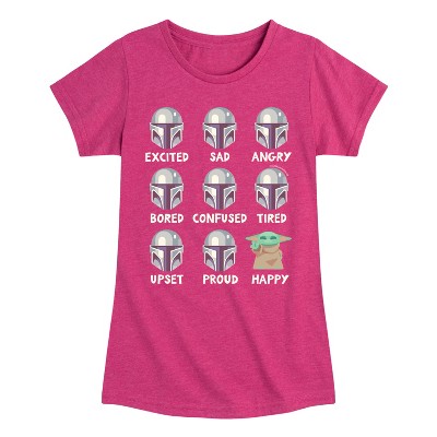 The Mandalorian - Mandalorian Moods - Youth Girls Shirt Tail Raglan T-Shirt - Embark on a legendary adventure with our officially licensed The Mandalorian graphic apparel collection! Inspired by the hit Star Wars series, this collection features bold designs showcasing the iconic Mandalorian bounty hunter, Din Djarin, his mysterious companion Baby Yoda (Grogu), and the action-packed moments from their journey through the galaxy. From the Mandalorian’s signature armor and the unmistakable helmet to the touching bond between Mando and Grogu, each piece captures the spirit of this thrilling series. Whether it's a graphic tee, hoodie, or sweatshirt, this collection combines comfort with the rugged, adventurous energy of The Mandalorian. Join the quest, protect the Child, and represent the way of the Mandalore in style!