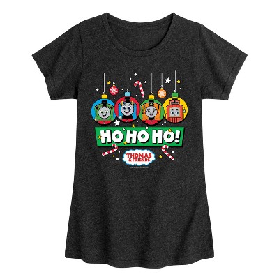 Thomas & Friends - Thomas Ho Ho Ho- Youth and Toddler Girls Fitted Short Sleeve Graphic T-Shirt - All aboard for fun with Thomas & Friends graphic apparel! Featuring Thomas the Tank Engine, Percy, and James, these cheerful designs are perfect for fans of the Island of Sodor and its friendly locomotives.