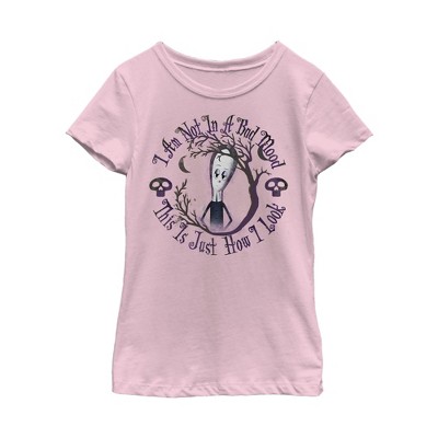 Stare down ordinary style with this officially licensed Girls' Netflix Wednesday Cartoon Addams Graphic T-Shirt! Featuring a cartoon-style Wednesday front and center, serving up her signature deadpan glare, this shirt is all attitude with zero effort. Behind her, her name is printed and repeated like a stylish chant because once isn't enough for a legend. Perfect for those who express more with a blink than most do with a monologue, this tee delivers serious shade in the most fashionable way. Wear it like you mean it—emotionally unavailable, sartorially unstoppable.