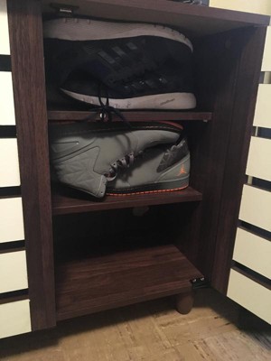 - Storage capacity: 3-Door: 3 shelves space with 2 fixed dividers. Each shelf measures 42"W x 11"D x 7" behind each door; Can hold up to 14 pairs of shoes