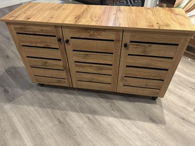 With a compact yet elegant design, the Gisela shoe cabinet is perfect for homes with limited space. Made in Malaysia, the Gisela is constructed from sturdy wood featuring a natural oak brown finish that adds an air of warmth to any space. Three doors conceal six shelves with storage space for up to 14 pairs of shoes, depending on size. Requiring assembly, the Gisela utilizes a slatted design on the doors to enable air circulation and reduce odor buildup. Offering convenient utility in a sleek modern design, the Gisela shoe cabinet is a fantastic upgrade to the modern home. Dimensions: 26.30" High x 44.50" Wide x 13.10" Deep; Left Shelves Dimensions: 6.90" High x 28.03" Wide x 9.25" Deep; Right Shelves: 6.90" High x 14" Wide x 9.25" Deep