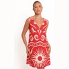 Designed to capture the essence of warm, carefree days, this dress features a playful mini length and a sleek V-neckline that adds a touch of effortless elegance. The standout front cut-out, accented with delicate bead detail on the bust, makes it a true statement piece.