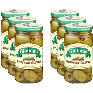Giuliano Stuffed Jalapeno Olives - Case of 6 - 6.5 oz. Premium quality since 1959, world's finest. Always fresh and full of flavor. The Giuliano stuffed jalapeno olives will taste great when served with food platters or beverages.