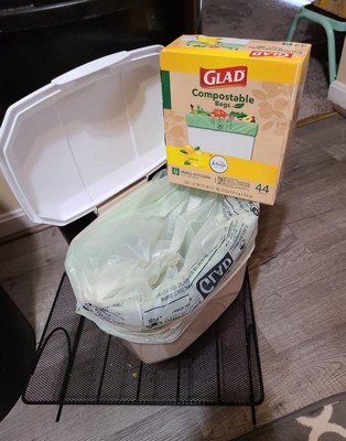 Keep your compost bin clean and fresh with Glad Compostable Small Kitchen Trash Bags. Backed with Glad strength, these durable 2.6-gallon compost trash bags can handle your heaviest compost loads with ease. With a flat top and standard opening, these compostable trash bags are easy to change as needed to keep your kitchen compost bin fresh and clean. Compostable Glad kitchen trash bags meet the requirements of municipal compost programs, so it's easy to incorporate or continue the eco-friendly habit of composting in your household. Each of these compostable bags measures 16.3 inches by 16.5 inches, making it an ideal choice for kitchen countertop compost bins or other small trash bins throughout your home or yard. For best results, store Glad compostable kitchen garbage bags in a cool, dry area, and use them within one year of purchase. Product contains compostable elements. It's better than all good. It's all Glad. USAGE DIRECTIONS: Tie bag in a knot to close and carry from container. Use bags within one year of purchase. Store bags in a cool, dry area. CAUTION STATEMENTS: To avoid danger of suffocation, keep all plastic bags away from babies and children. Do not use plastic bags for food storage.