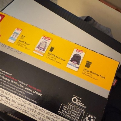 Glad ForceFlex Heavy Duty Large Trash Bags are the ideal solution for all your toughest cleanup jobs, indoors or outdoors. Featuring seven benefits in one bag, these 30 gallon trash bags hold 80+ pounds and have stretchable strength, leak protection, superior drawstrings and large capacity. Plus, these heavy duty garbage bags are rip and tear resistant and guaranteed strong (1) so you can carry heavy loads without rips, tears or messy trash disasters. The strong drawstring grips the trash can to keep the large garbage bag in place, and it closes with a quick cinch when the bag is full. Once closed, the drawstring keeps the trash securely inside the bag, letting you confidently transport it to the curb. Each of these black trash bags measures 2 feet 6 inches by 2 feet 8 inches, making it just the right size for large garbage cans. It's better than all good. It's all Glad. (1) See packaging for more information. USAGE DIRECTIONS: Secure the bag by pulling up on the drawstring and lift the bag from the container. Knot the drawstrings for added security. Carry the bag by the drawstrings to the curb. CAUTION STATEMENTS: WARNING: To avoid danger of suffocation, keep all plastic bags away from babies and children. Do not use plastic bags in cribs, beds, carriages or playpens. Not recommended for food storage.