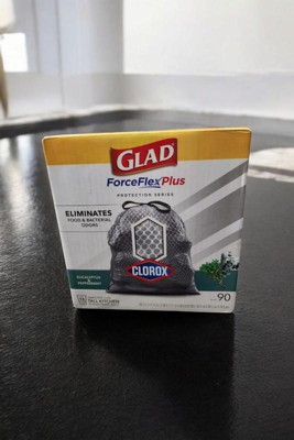 - DRAWSTRING TRASH BAGS: Forty-five (45) 13-gallon Glad ForceFlex MaxStrength With Clorox Drawstring Tall Kitchen Trash Bags in Eucalyptus and Peppermint scent