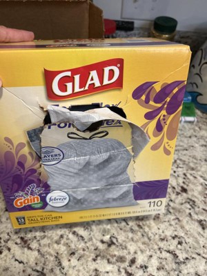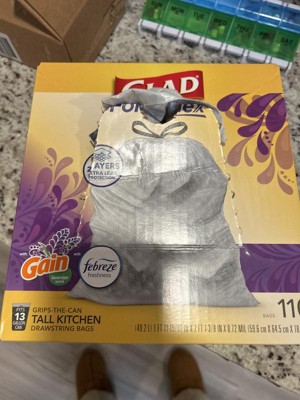 Let the stretchable strength of Glad ForceFlex handle all the messes our busy daily life can throw at it and then some. Glad Tall Kitchen Drawstring Trash Bags are designed with ForceFlex technology to give extra flex as it expands around sharp edges and heavy loads, so you can pack it in while resisting tears, rips and punctures. These trash bags are designed with two layers for extra leak protection. RipGuard technology prevent bags ripping to avoid leaks. Fight nasty kitchen odors with the exclusive Glad trash bag combination of steady release of Febreze freshness and irresistible Gain Original scent that traps, locks and neutralizes odors. The durable Grips The Can Drawstring ensures a tight grip on the trash can to keep it in place. Take the trash to the curb with no fear of leaks and tears, and no frustration. FEBREZE and GAIN are used under license from The Procter & Gamble Company or its affiliates. USAGE DIRECTIONS: Lift the trash bag from the container by pulling the drawstrings on either side of the bag. Knot the drawstrings for added security. Carry the bag by the drawstring and toss into garbage. CAUTION STATEMENTS: Plastic bags can be dangerous. To avoid danger of suffocation, keep all plastic bags away from babies and children. DO NOT USE FOR FOOD STORAGE.