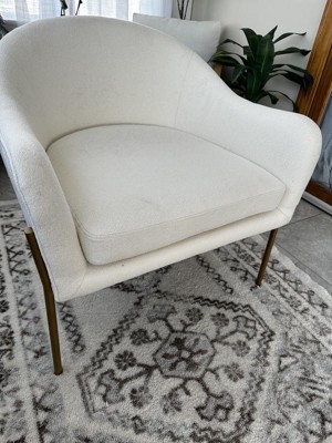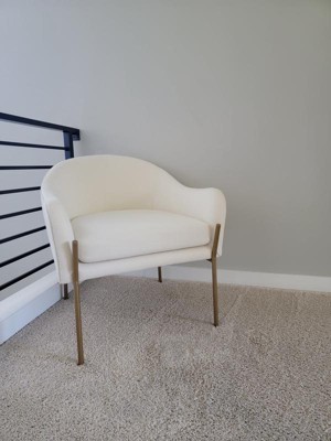 Update your indoor seating arrangement with this Gladden Barrel Accent Chair from Threshold™. This accent chair with a barrel-like silhouette makes a stylish addition to any room. Upholstered in cream boucle fabric with a removable seat cushion, a curved back and armrests, it will pair elegantly with your existing setting and offer a comfy sitting experience. Plus, the gold-tone brass legs in a powder-coated finish add luxe appeal.