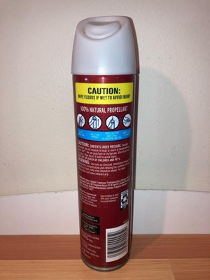 WARNINGS: CONTENTS UNDER PRESSURE. Contains propellant. Do not expose to heat or store at temperatures above 120°F. Do not puncture or incinerate. Store in a cool, dry place. Some hard surfaces may become damp if sprayed. Avoid slips or falls. KEEP OUT OF REACH OF CHILDREN AND PETS. WARNING: Use only as directed. Intentional misuse by